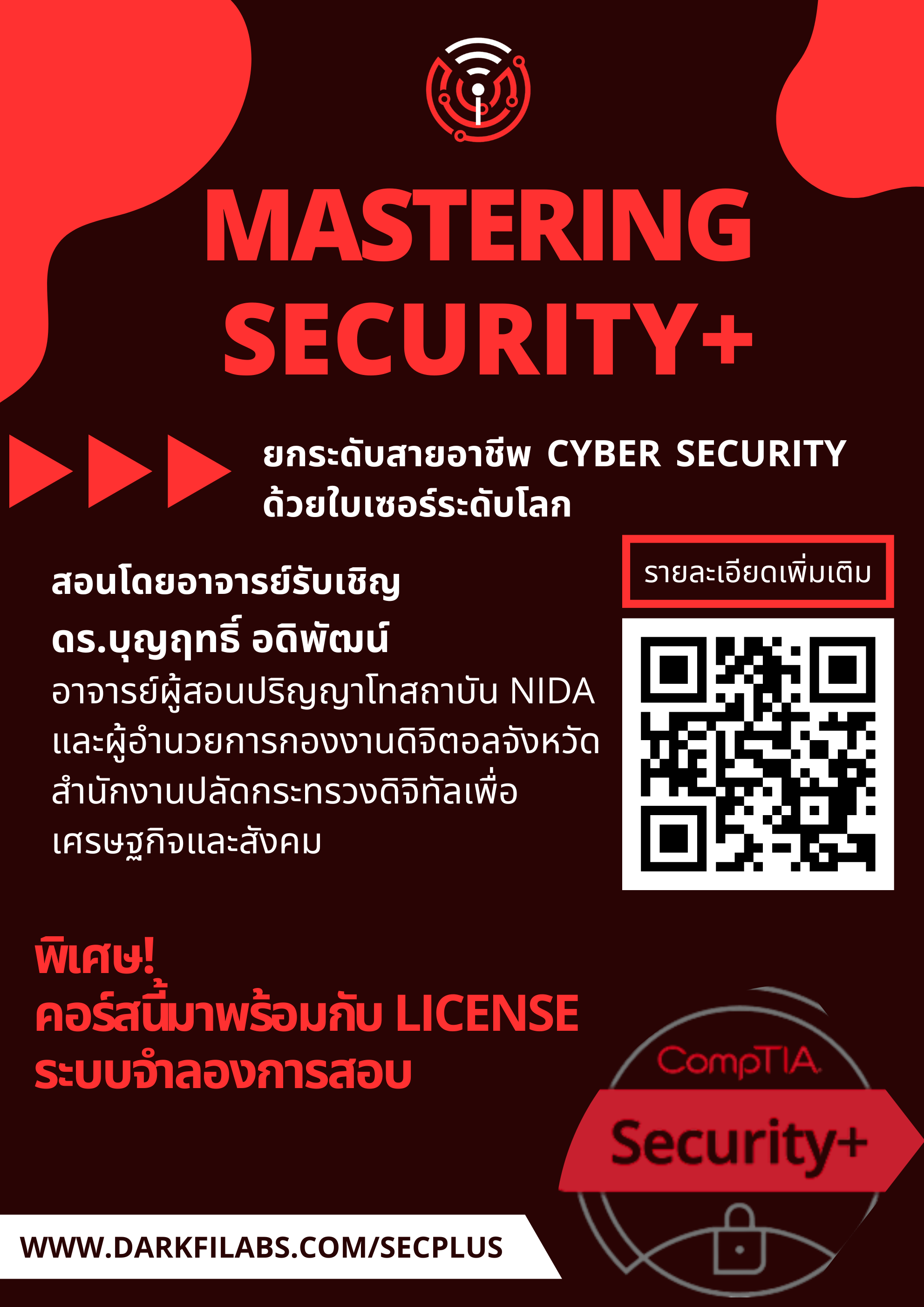 คอร์สเรียน CompTIA Security+ สำหรับผู้เริ่มต้น เจาะลึกเนื้อหาสำคัญและเทคนิคการสอบ SY0-701 พร้อม Workshop และ Simulation สอบจริง เหมาะสำหรับผู้ที่ต้องการสอบผ่านและเข้าใจพื้นฐาน Cybersecurity อย่างมั่นใจ